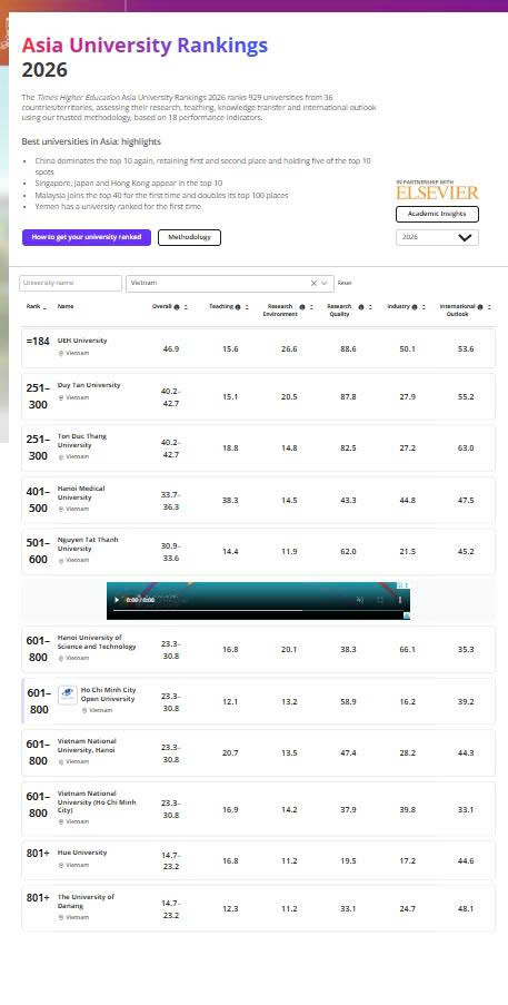 UEH dẫn đầu các đại học Việt Nam, giữ vững Top 250 đại học Châu Á 2026