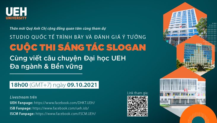 Sau gần một tháng khởi khởi động, “Cuộc Thi Sáng Tác Slogan – Cùng Viết Câu Chuyện Đại Học UEH Đa Ngành Và Phát Triển Bền Vững” đã nhận được sự ủng hộ tích cực của Cộng đồng sinh viên UEHer và Cộng đồng sáng tạo trong nước và quốc tế. Với hơn 150 bài dự thi được gửi về, trong đó có gần 30% là bài thi quốc tế. Tiếp tục trên chặng hành trình tìm ra slogan cho Đại học UEH Đa ngành và Bền vững giai đoạn 2021 – 2025. UEH trân trọng kính mời các bạn sinh viên tham gia sự kiện Studio Quốc tế Trình Bày Và Đánh Giá Ý Tưởng. Đây là vòng tốp các bài dự thi xuất sắc nhất trình bày trước Hội đồng Ban Giám khảo chuyên môn.