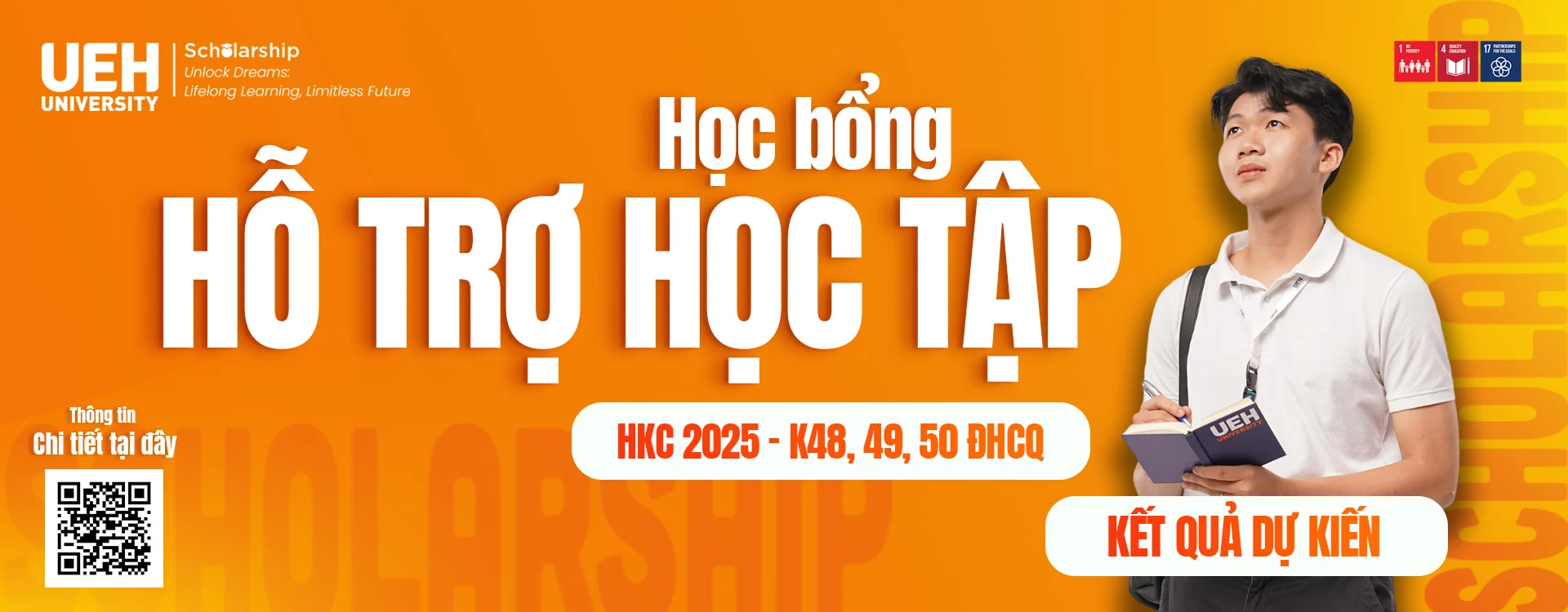 Lưu ý: Sinh viên phản hồi kết quả học bổng Hỗ trợ học tập HKC 2025 trong thời gian từ ngày 28/4 đến hết 14g00 ngày 06/5 qua biểu mẫu: TẠI ĐÂY (Sinh viên sử dụng email UEH để truy cập biểu mẫu). Sau thời gian này, Bộ phận học bổng sẽ ban hành quyết định học bổng chính thức và không tiếp nhận/xử lý bất kỳ phản hồi nào khác.