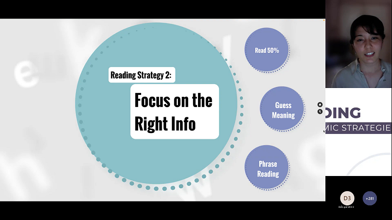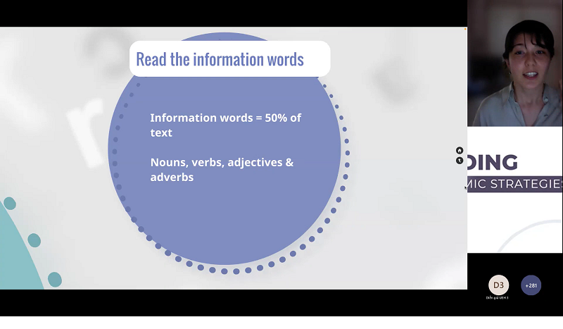 Diễn giả chia sẻ, đôi khi việc đọc các tài liệu học thuật còn gây khó khăn đối với người nói tiếng Anh bản ngữ, nhất là khi có quá nhiều tài liệu để đọc trong thời gian ngắn. Vì vậy, để cải thiện kỹ năng đọc và tăng khả năng hiểu của bản thân, bạn cần có chiến lược cụ thể và thử nghiệm nhiều phương pháp để tìm ra cách đọc phù hợp với bản thân.