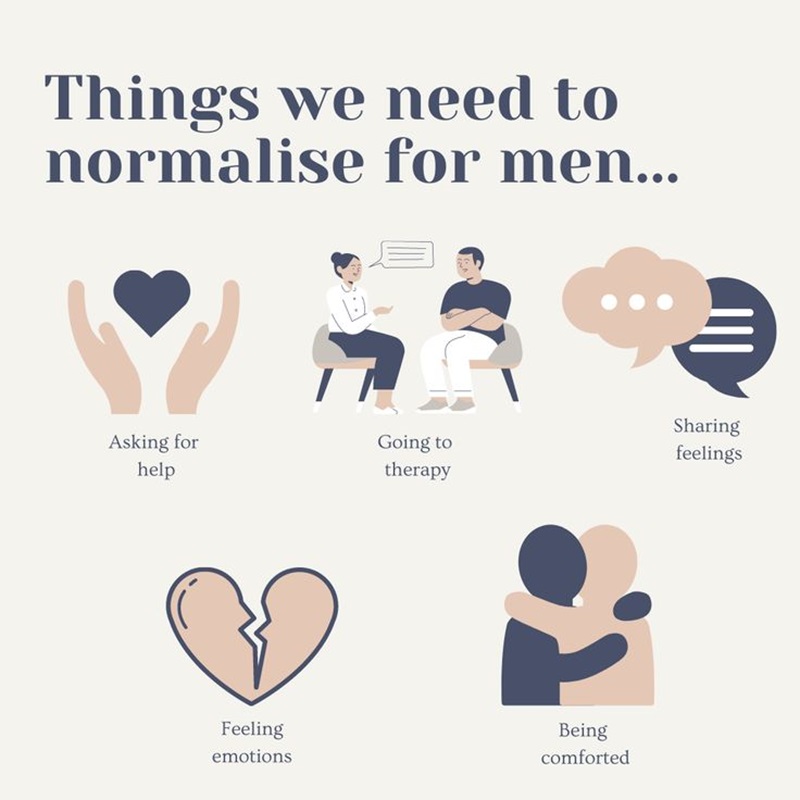 Việc phá vỡ định kiến giới bao gồm bình thường hóa việc chăm sóc sức khỏe tinh thần của nam giới nhằm bảo vệ sức khỏe tâm lý của họ (Nguồn: Hope Therapy and Counselling Services)